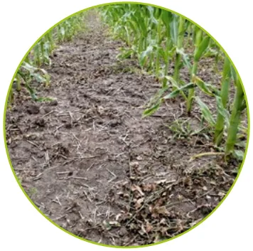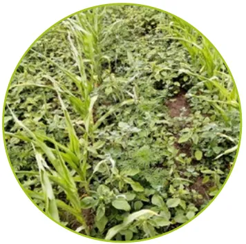 На контрольной делянке (без обработки) чётко видно сильное засорение посевов кукурузы, при этом доминантными видами являются двудольные сорняки (марь белая, амброзия полыннолистная, щирица запрокинутая, дурнишник обыкновенный, канатник Теофраста, вьюнок полевой), из однолетних злаковых присутствуют просо куриное и щетинник).