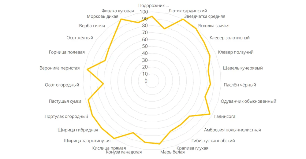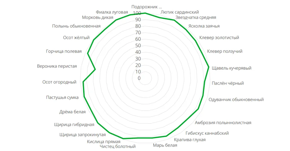 Препарат показал высокую биологическую эффективность, сорняки уничтожены на 95–100%.