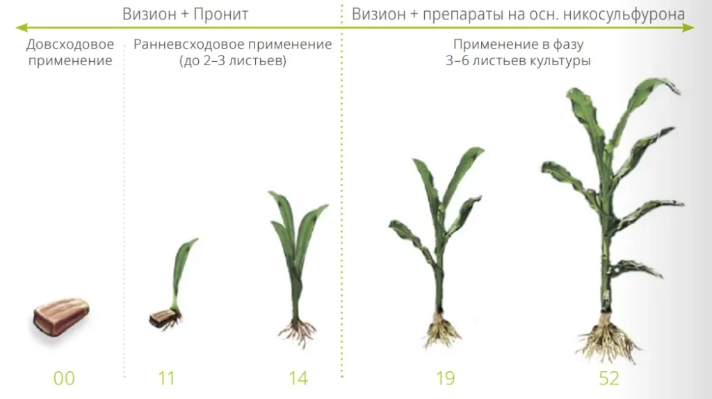 | Визион + препараты на основе никосульфурона Фаза 3–5 листьев культуры ВИЗИОН, ВДГ 0,25кг/га НИКОСУЛЬФУРОН, 40–60г д.в./га | Широкий спектр контролируемых сорняков. Длительный период защиты — контроль второй волны сорняков. Наличие эффекта «сжигания» сорняка (действие амикарбазона). Удобство варьирования нормами расхода препаратов-партнёров для решения задач на каждом поле (контроль эффективности и рентабельности). Меньшее содержание мезотриона на га (снижение риска последействия). Высокая селективность к культуре |