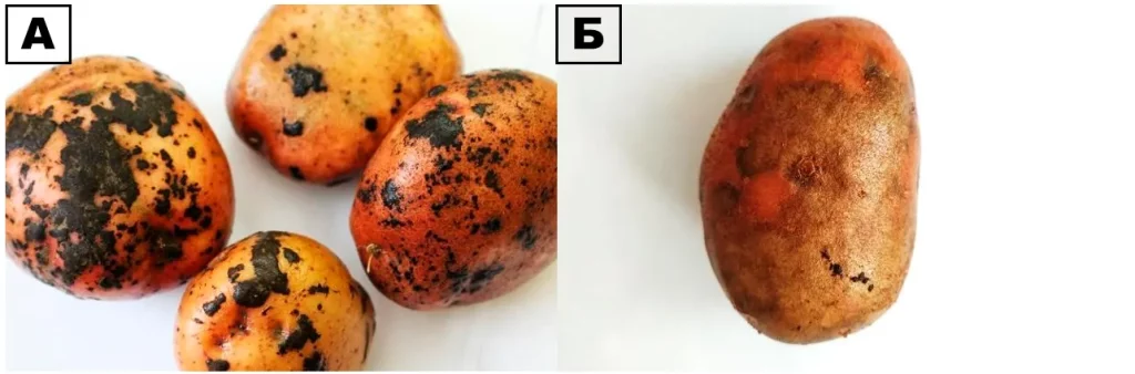 - для защиты семенного материала от почвенно-клубневой инфекции проводится предпосадочная обработка клубней однокомпонентными фунгицидами на основе флудиоксонила и флуксопироксада или препаратамии, содержащими 2 (пенфлуфен + протиоконазол) или 3 действующих вещества (флудиоксонил +имазалил + металаксил). Для защиты от ризоктониоза проводят предпосадочную обработку клубней биопрепаратами на основе спор и продуктов метаболизма бактерий Bacillus subtilis. Последовательные обработки, включающие обработку клубней перед посадкой и в фазы бутонизации и цветения культуры проводят биопрепаратами на основе Bacillus amyloliquefaciens, Pseudomonas aureofaciens, Trichoderma asperellum: обработка клубней перед посадкой с расходом рабочей жидкости 10 л/т и опрыскивание при высоте растений 10–15 см, в фазы бутонизации и цветения с расходом рабочей жидкости 300 л/га;