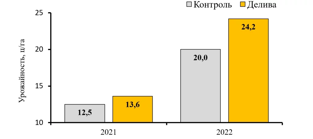 Средняя урожайность ДЕЛИВА® за 2021–2022 гг. испытания составила 18,9 ц/га, максимальная – 35,2 ц/га получена в 2022 г. на ГСХУ «Жировичская СС». Сорт Делива превысил по урожайности стандарт в годы сортоиспытания в среднем на 2,7 ц/га (16,3 %).
